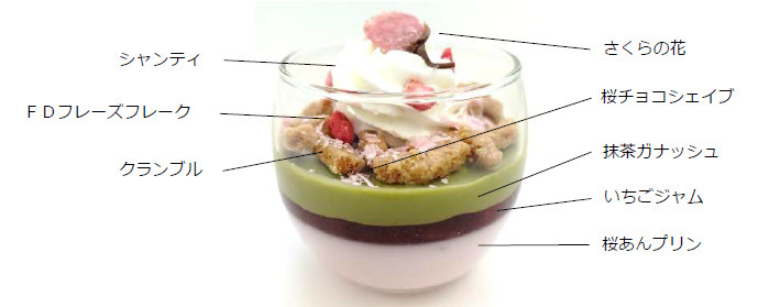 桜あんプリン、いちごジャム、抹茶ガナッシュを重ねた春らしい3層仕立てのミニパフェ。