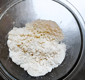 ➂指先でバターの粒をつぶしながら粉にまぶしていく。