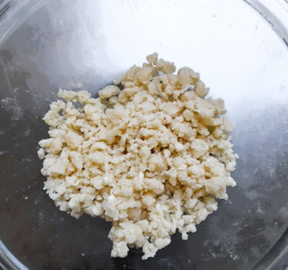 ➃大小の塊が出来てぽろぽろの状態になったら完成。生地はバターがなじんで全体が黄色味がかった状態になります。